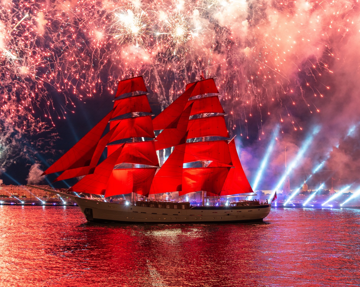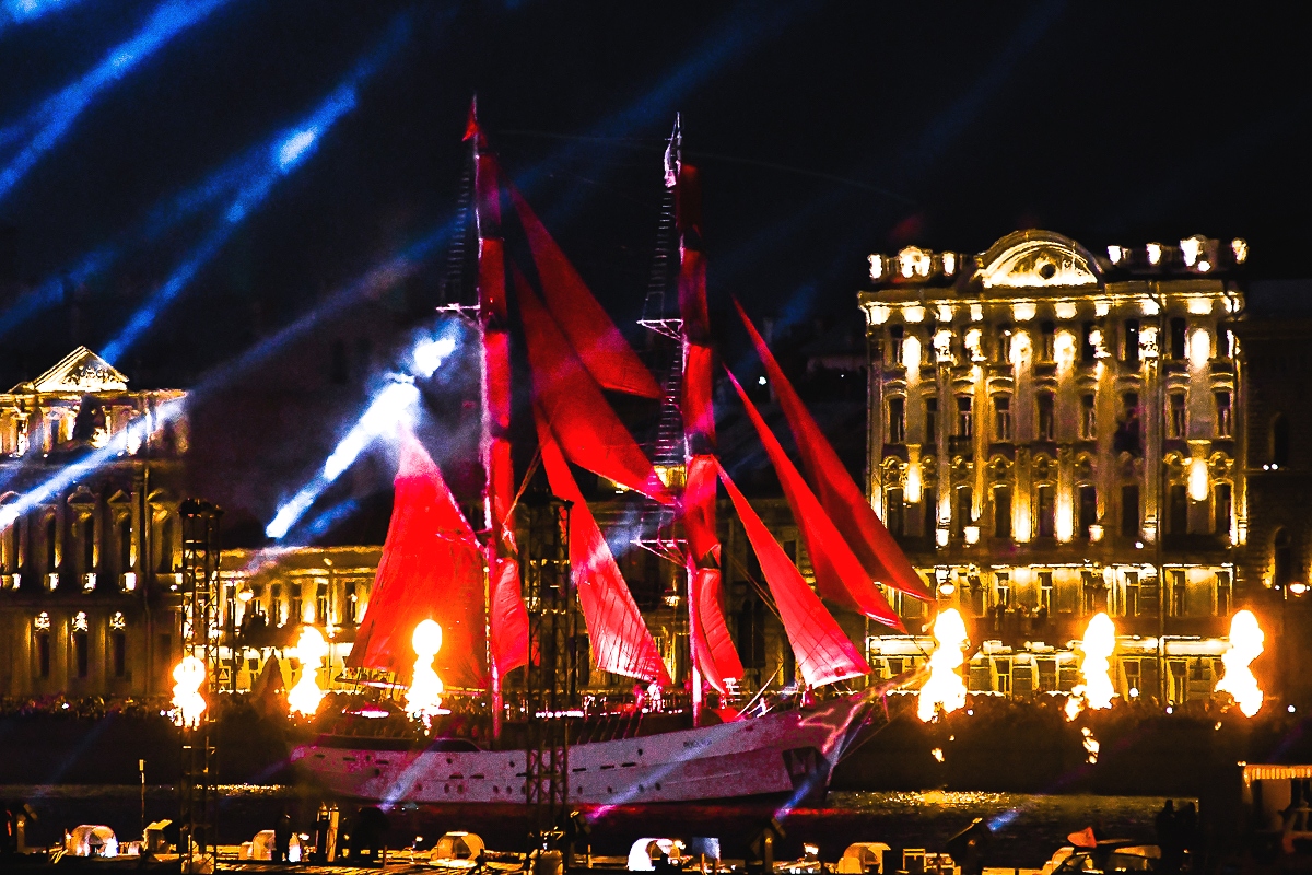 «Алые паруса», придуманные в 1968 году инициативной творческой группой Ленинградского Дворца пионеров как общегородской выпускной, сегодня стали мультимедийным шоу и единственным российским праздником, включенным в реестр мирового событийного туризма. Чем же запомнятся нам «Алые паруса» 2019 года? Помимо пиротехнического шоу и театрализованного представления на Дворцовой площади и других площадках, у стен Петропавловской крепости на берег вышли 33 богатыря из сказки А.С. Пушкина, а эффектные танцы аквабайкеров на летающих досках можно было наблюдать между Дворцовым и Троицким мостами.