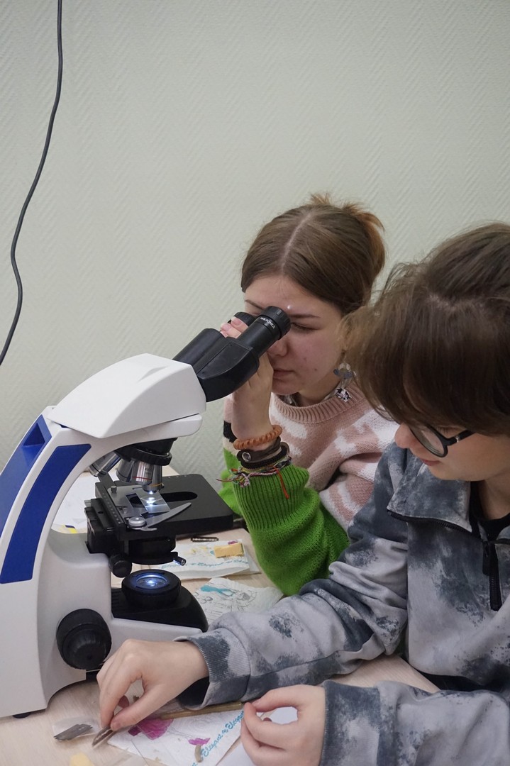 Старшие ребята со спецкурсом «Методы общей биологии» изучали животные и растительные ткани, учились делать срезы и микропрепараты.