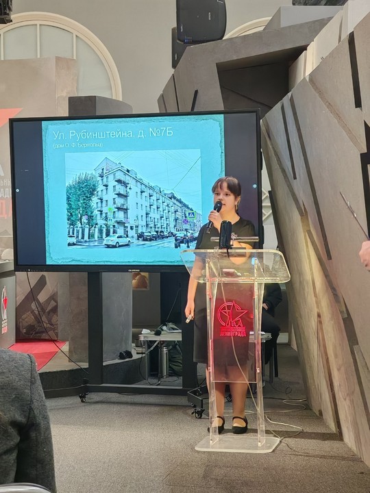 - 1 место (в возрастной категории 12-14 лет) заняла Маргарита Забашта с выступлением на тему «Ленинградская блокада: история одного дома».