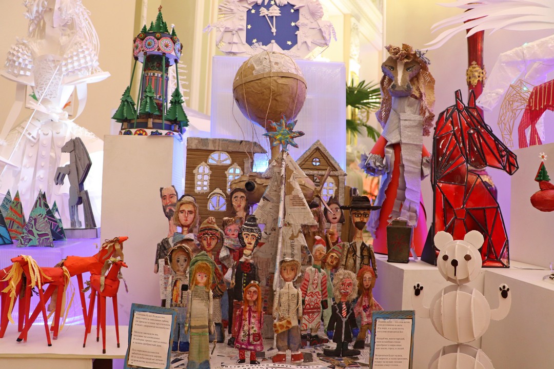 Большую елку в Зимнем саду и маленькую елочку в экспозиции также украшают новогодние игрушки, специально сделанные на занятиях в студиях и коллективах из самых разных материалов. Особенная и самая большая коллекция представлена творческой мастерской «Ухтышка» из гимназии №406 города Пушкина.