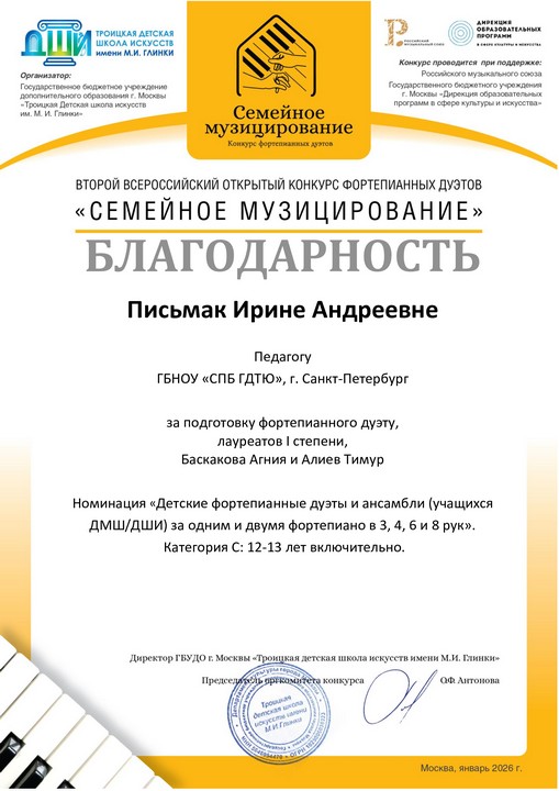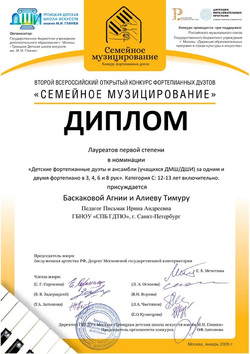 В январе в Троицкой детской школе искусств им. М.И. Глинки Москвы при поддержке Российского музыкального союза прошел Всероссийский открытый конкурс фортепианных дуэтов «Семейное музицирование».