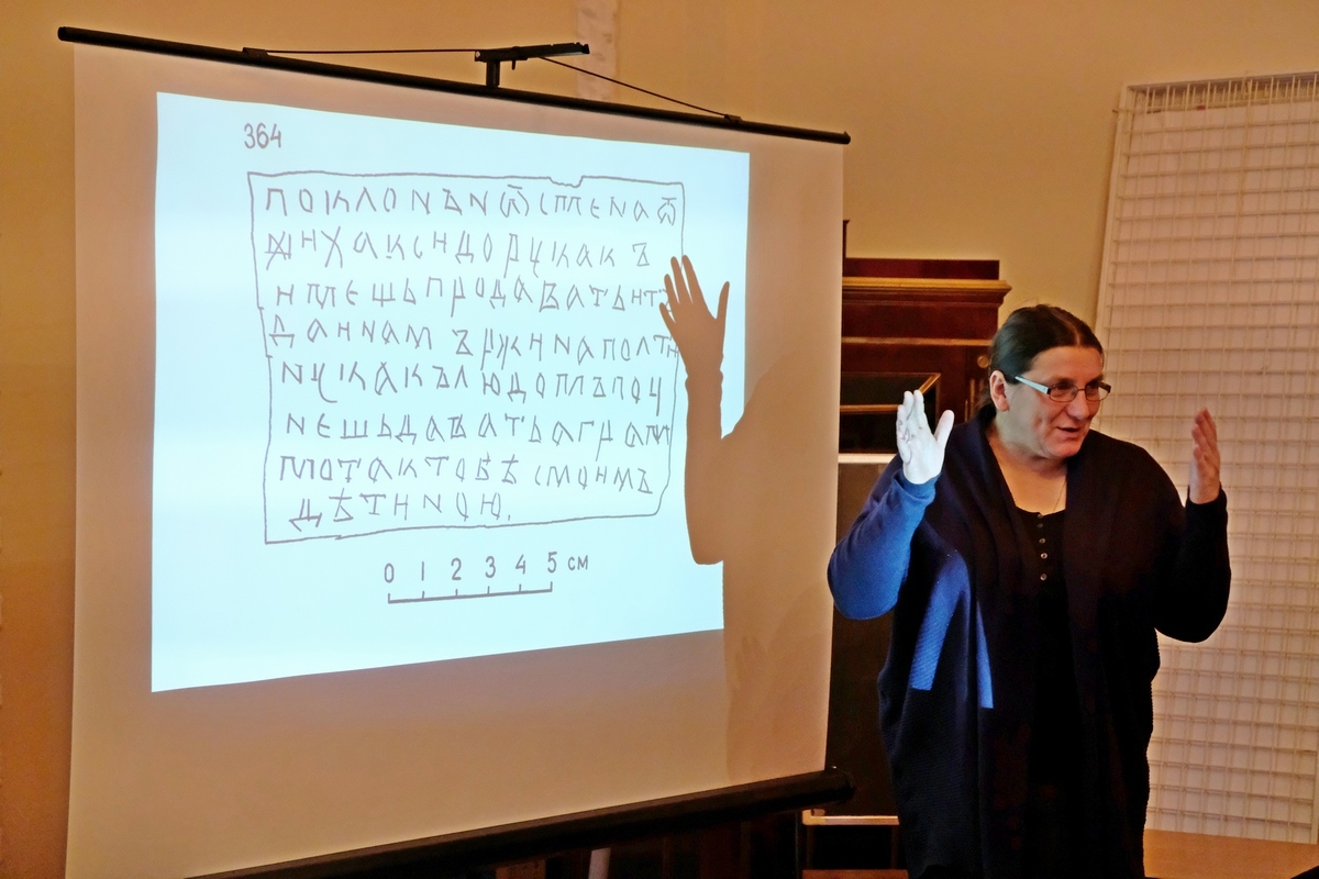 Особый интерес у слушателей вызвали берестяные грамоты. Тамара Александровна рассказала о том, как создавались эти памятники письменности и какие послания могли содержать, и прочла вместе с собравшимися текст одной из грамот, расшифровывая некоторые знаки. Стоит отметить, что юные археологи не раз находили берестяные грамоты во время экспедиций; попробовать прочитать и узнать перевод одной из обнаруженных ребятами грамот можно на сайте «Древнерусские берестяные грамоты»: http://gramoty.ru/birchbark/document/show/novgorod/1020/.