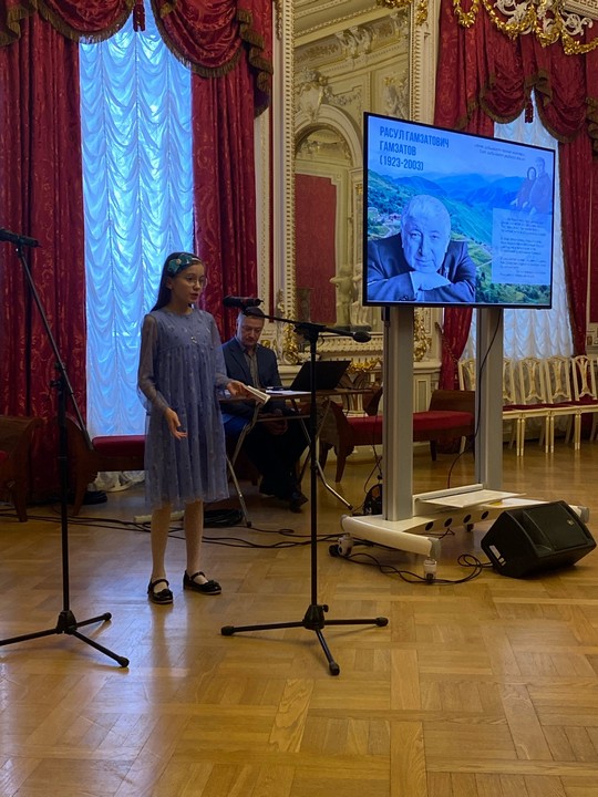 Стихи Расула Гамзатова прозвучали в замечательном исполнении воспитанниц Студии художественного слова Евы Выскребенцовой, Ольги Ивановой и Виктории Ревва. Педагог студии О.Л. Павлова подготовила программу поэтического выступления, представившего многогранность творчества Р. Гамзатова. Особо проникновенно звучали его стихи в исполнении ведущей вечера, педагога-организатора отдела гуманитарных программ и детских социальных инициатив Л.Г. Урусовой, превратившей концерт-награждение в настоящий праздник.