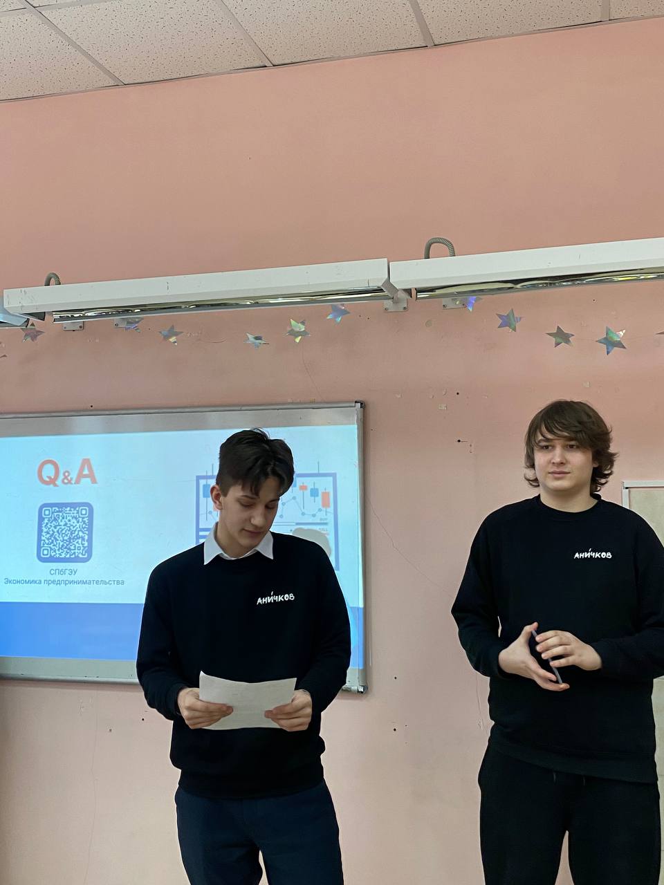 21 марта в Аничковом лицее студенты Кафедры экономики предпринимательства совместно с Кафедрой бухгалтерского учета и анализа СПбГЭУ: Бокова Эвелина, Галилеева Ксения, Россова Алла, Смыслова Мария, Стратичук Оксана, Трейгер Лилия провели урок «Финансовая грамотность. Стартап». Приятным фактом стало то, что Галилеева Ксения - выпускница Аничкова лицея.