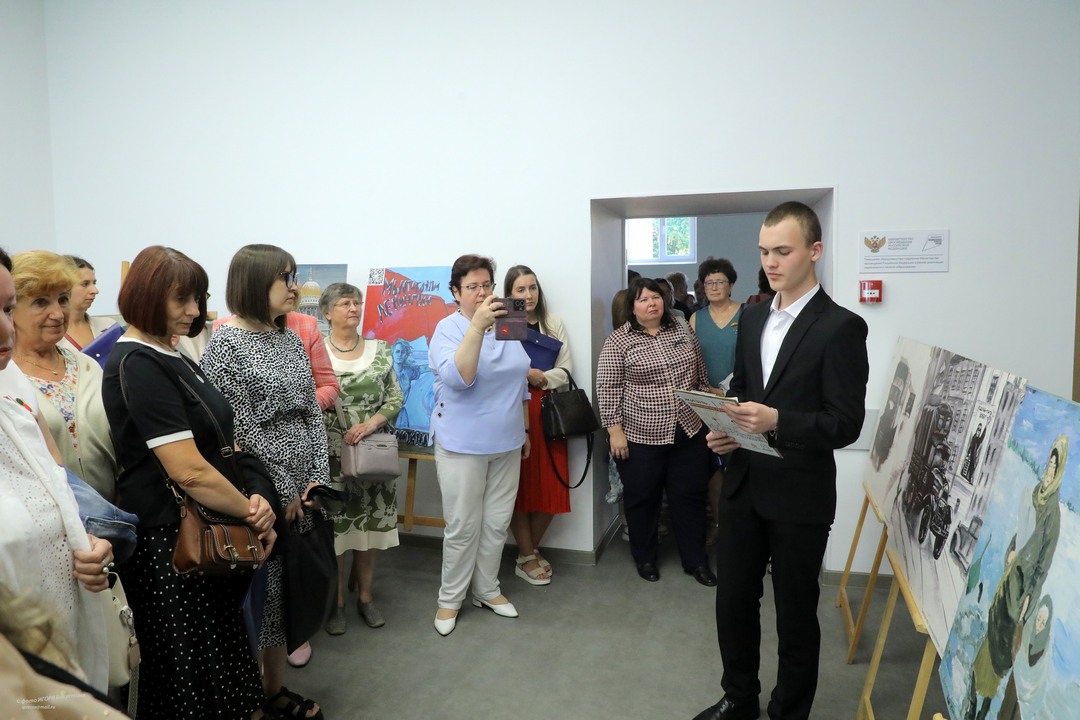 Перед второй частью стратегической сессии школьники из разных районов города провели для участников экскурсию по выставке работ победителей Всероссийского конкурса детского рисунка «Жизнь, деленная на граммы». Рисунки юных художников посвящены теме Великой Отечественной войны.
