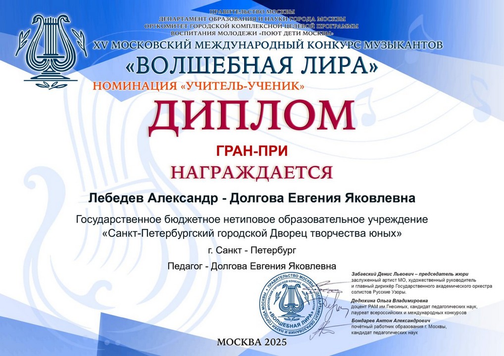 В номинации «Учитель-ученик» учащийся Сектора фортепиано и теории музыки Александр Лебедев и его педагог Евгения Яковлевна Долгова завоевали Диплом гран-при!