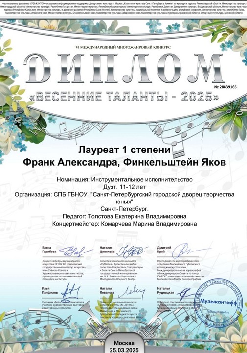 В номинации «Инструментальное исполнительство» солисты Струнного сектора Яков Финкельштейн и Александра Франк (дуэт) завоевали Диплом лауреата I степени, а также стали лауреатами I степени в сольном исполнительстве.