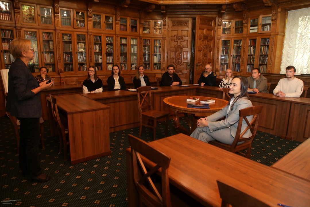 Благодаря рассказам заведующей Библиотеки Дворца Светлане Мангутовой молодые специалисты узнали об истории и «тайной комнате» Библиотеки, а также о правилах пользования библиотечным фондом, вариантах сотрудничества и совместной организации мероприятий.