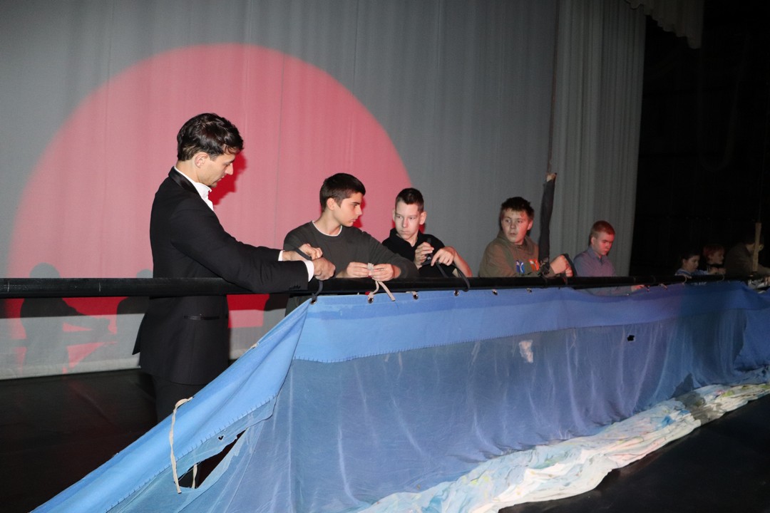 Школьники смогли побывать в тех частях театра, которые обычно простому зрителю недоступны и попробовать себя в роли осветителей, звукорежиссёров, монтировщиков сцены и, конечно, артистов.