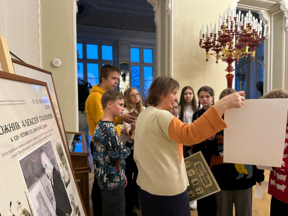 Все полученные знания школьники сразу же применили на практике. В Торшерной гостиной Аничкова дворца сейчас открыта выставка литографий Алексея Пахомова, приуроченная к 125-летию со дня рождения художника.