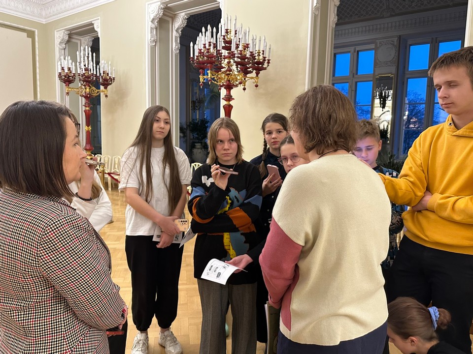 Екатерина Павловна Загорская, ведущий библиограф Библиотеки Дворца, рассказала ребятам об экспозиции, интересных фактах из жизни художника и о процессе подготовки выставки, а затем ответила на множество вопросов юных корреспондентов.