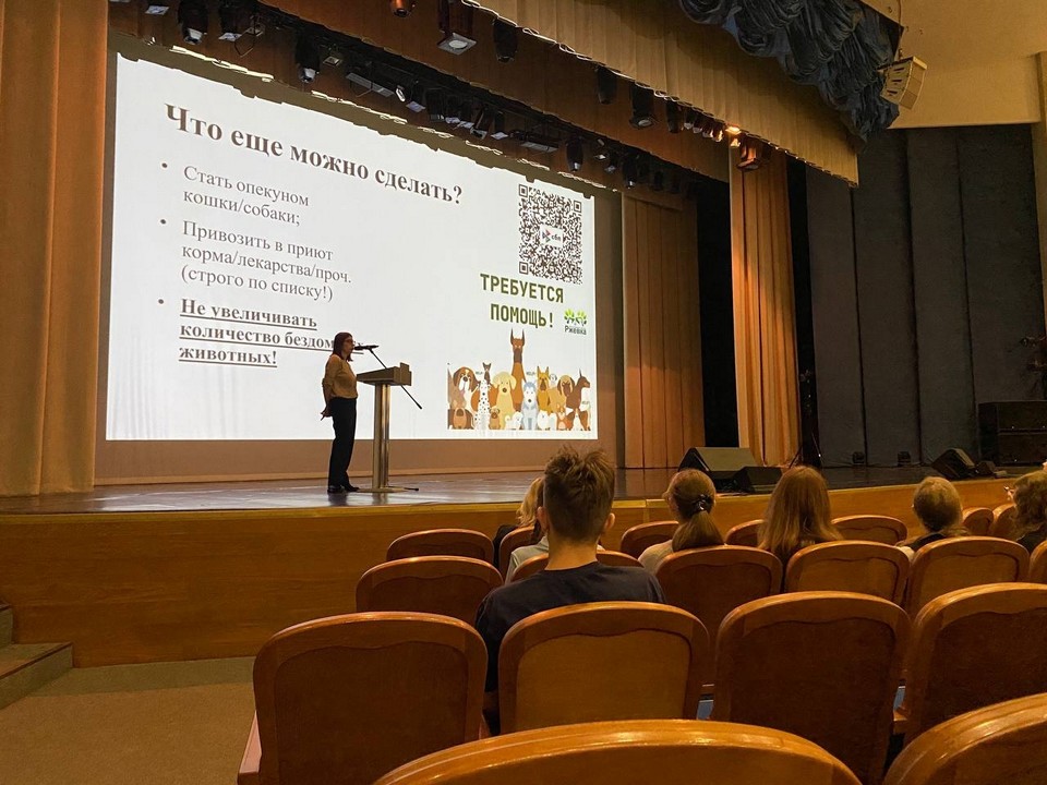 Анна Александровна рассказала ребятам о волонтёрской деятельности в приюте для животных «Ржевка», где на выезде школьники уже помогали в уходе за животными: кормили, играли и выгуливали.