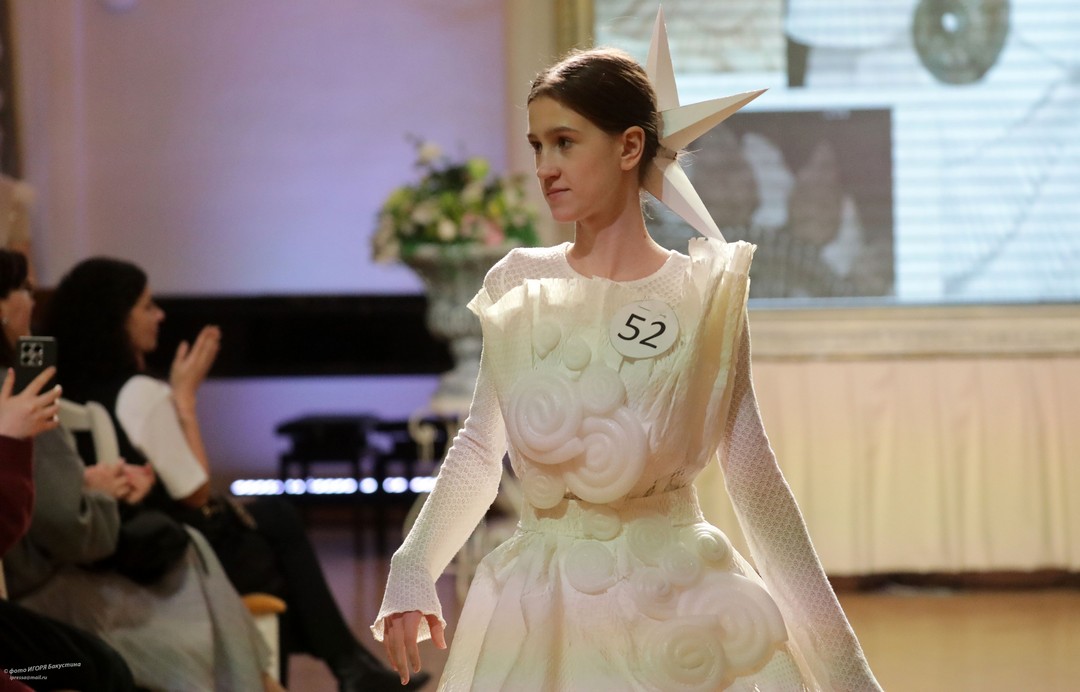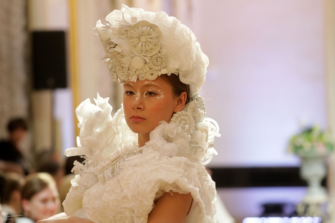 Невероятный полет фантазии увидели члены жюри и зрители. По условия конкурса работы должны быть выполнены с использованием нетрадиционных для создания одежды материалов, различных фактур и только белого цвета. Участники ответственно подошли к созданию своих моделей: использовали пленку в качестве юбки, строительные жгуты как кости древних животных, из бумаги делали голову динозавров и многое другое!