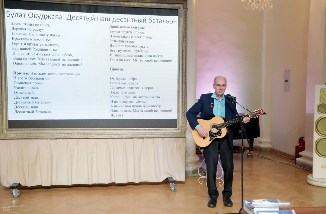 Завершилось мероприятие песней Булата Окуджавы «Десятый наш десантный батальон» в исполнении представителя Межрегионального общественного патриотического движения «Вечно живые» Александра Вальтеровича Петерсона.